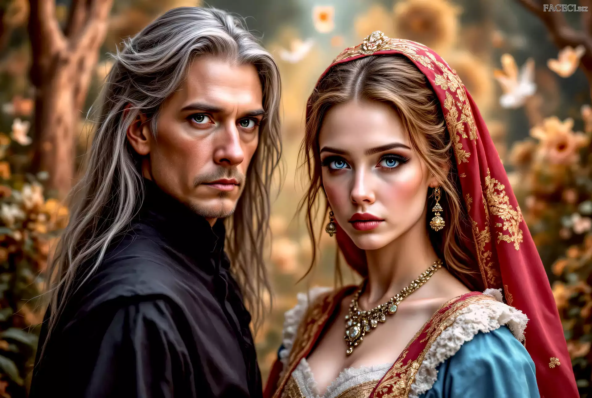 Długowłosy, Kobieta, Czerwony, Bizuteria, Grafika, Welon, Mężczyzna